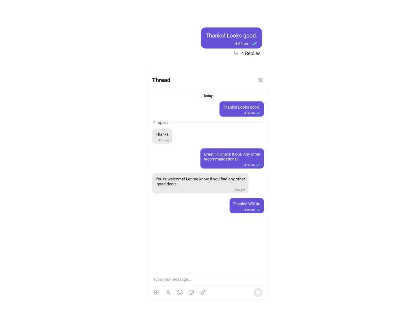 | Threaded Messages | Threaded Messages that displays all replies made to a particular message in a conversation. |