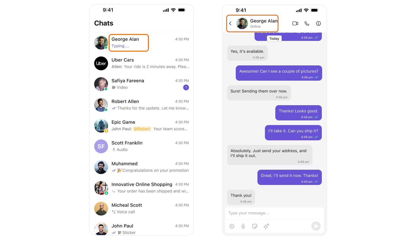 CometChat’s User Presence feature allows users to see whether their contacts are online, offline. This helps users know the best time to initiate a conversation and sets expectations about response times.